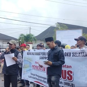 OKU Selatan Sumsel–Puluhan massa yang tergabung dalam Aliansi Masyarakat Peduli Pembangunan OKU Selatan (AMPPOKUS) menggelar aksi unjuk rasa di depan Kantor DPRD