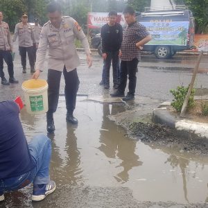 OKU Selatan, Sumsel–Puluhan personel Polres Ogan Komering Ulu Selatan (OKU Selatan) turun langsung memperbaiki jalan berlubang di kawasan Simpang Tiga Gunung Pasir,